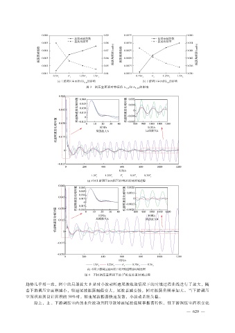 图 3 调压室面积对特征值 λ 7,8 和 λ 9,10 的影响 # 图 4 不同调压室面积下的 3机组转速时域过程 趋势几乎相一致,图中的局部放大 B是对小波动转速尾波收敛情况下的时域过程曲线进行了放大,随 着下游调压室面积减小,转速尾波振荡幅值变大,尾波衰减变慢,同时振荡角频率加大。当下游调压 室面积取到设计面积的 50%时,转速尾波振荡快速发散,小波动系统失稳。 综上,上、下游调压室内的水位波动共同导致转速尾波低频率振荡特性,但下游调压室面积变化 — 6 2 9 —