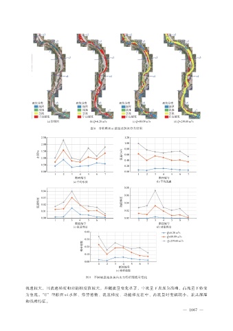 图 8 分析断面示意图及斑块分类结果 图 9 不同栖息地斑块内水力特征随流量变化 流速较大,且流速梯度和动能梯度值较大,并随流量变化显著,中流量下表现为浅滩,高流量下转变 为急流。“U”型断面 x4 水深、弗劳德数、流速梯度、动能梯度在中、高流量时变幅较小,兼具深潭 和浅滩特征。 — 1067 —