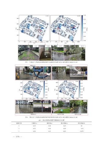 图 7 “贝碧嘉”台风积水情况模拟结果与实拍积水情况(灰色区域为建筑)(2024-09-16) 图 8 “普拉桑”台风积水情况模拟结果和实拍积水情况(灰色区域为建筑)(2024-09-20) 表 4 积水深度实测值与模拟结果比较 观测点位 实测值/m 模拟值/m 绝对误差/m 相对误差/% 1 0.15 0.18 0.03 20 2 0.24 0.26 0.02 8.33 3 0.16 0.13 -0.03 -18.75 — 1378 —