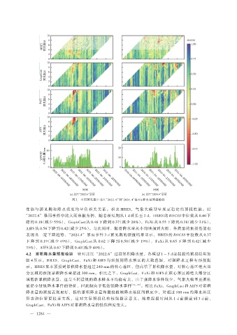 图 4 所示。HRES、GraphCast、FuXi 和 AIFS 均预报到降水落区的大致范围,对强降水过程有预报提